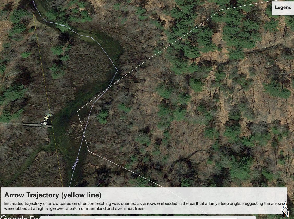 The potential trajectory, if extrapolated to all reasonable distances from which the arrow might have originated (considering minimums given the embed angles and maximums of powerful bows), travels about 200 yards downriver before entering into the Maine wilderness - a very difficult area to access and one that is not frequented much. This would suggest that it’s unlikely, though perhaps not impossible, that the origin of the arrows was so far away as to place it in the Maine wilderness. However, there seems to be another, closer, potential point of origin that, for very many reasons, seems far more probable.