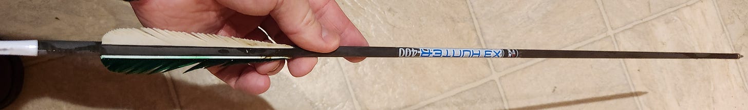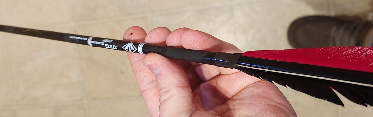 A thin scum layer where the arrows were partially submerged means they were there for a little while - weeks to months - and their notable absence during some fall construction work we did narrows the timeline for when they were fired to a couple weeks plus or minus of the prior shooting incident. Personally, I suspect the incidents are linked, and I suspect the arrows preceded the shooting, and were quite likely fired when my family and I were in the immediate area - passing by us silently and lying unnoticed until now. I suspect the combination of inefficacy (having missed us) and the lack of noticing the arrows emboldened the enemy to the use of a firearm afterward, likely opportunistically, while I was working on my vehicle.